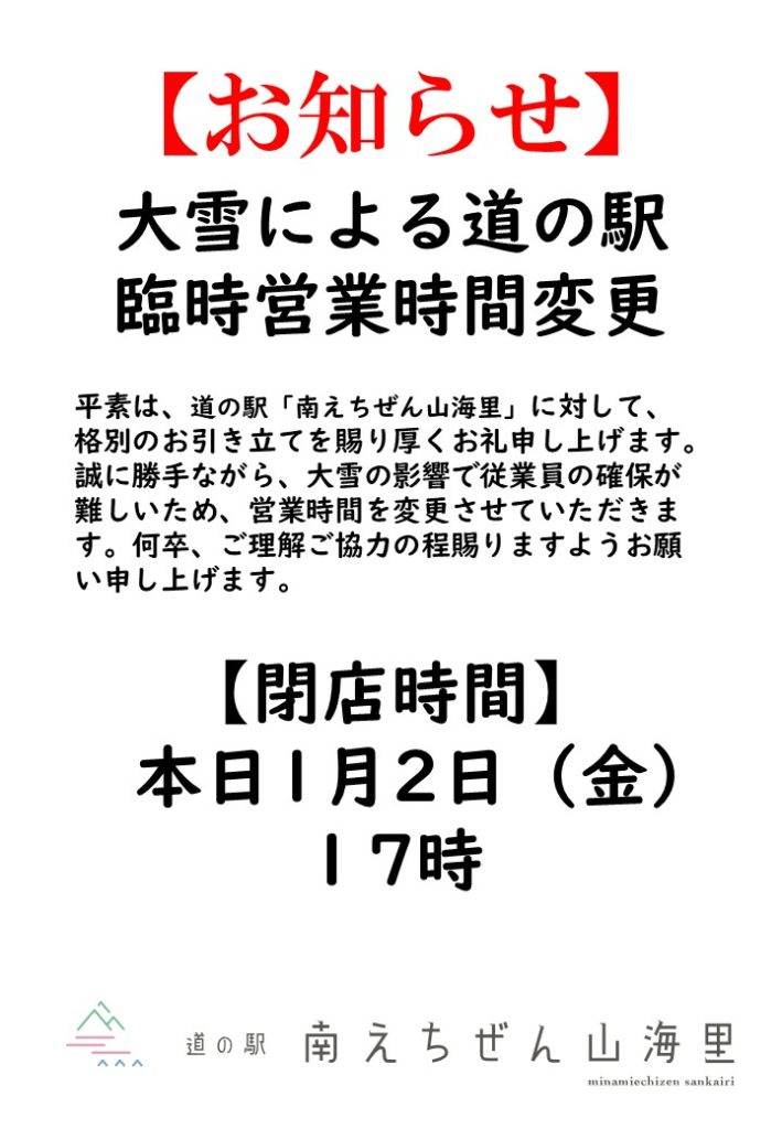 平素より道の駅 南えちぜん山海里をご利用賜り厚く御礼申し上げます。
