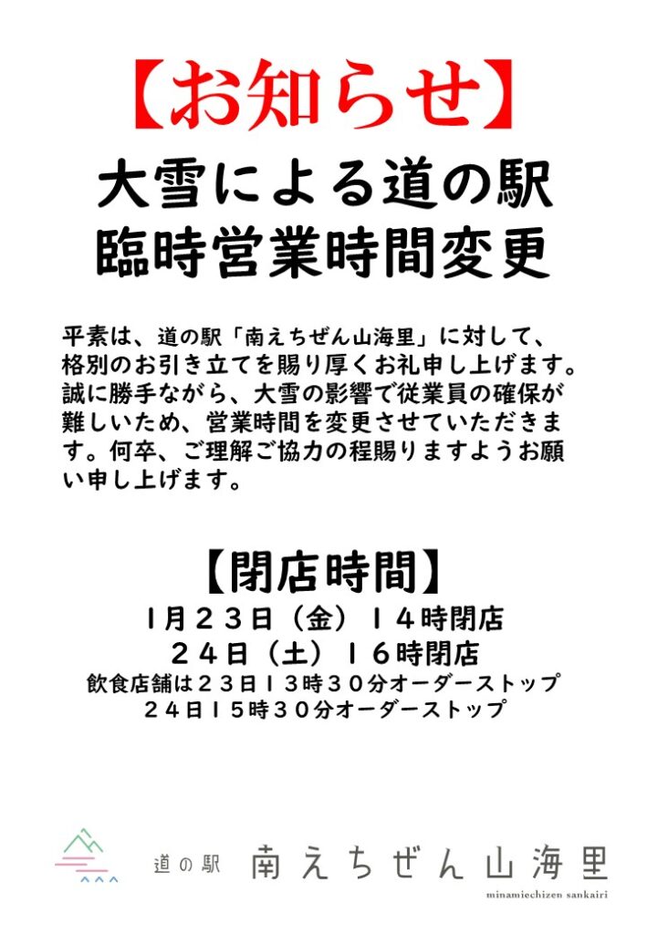 平素より道の駅 南えちぜん山海里をご利用賜り厚く御礼申し上げます。