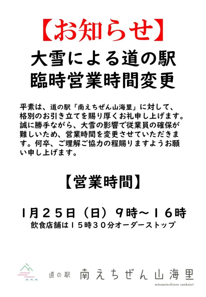 平素より道の駅 南えちぜん山海里をご利用賜り厚く御礼申し上げます。