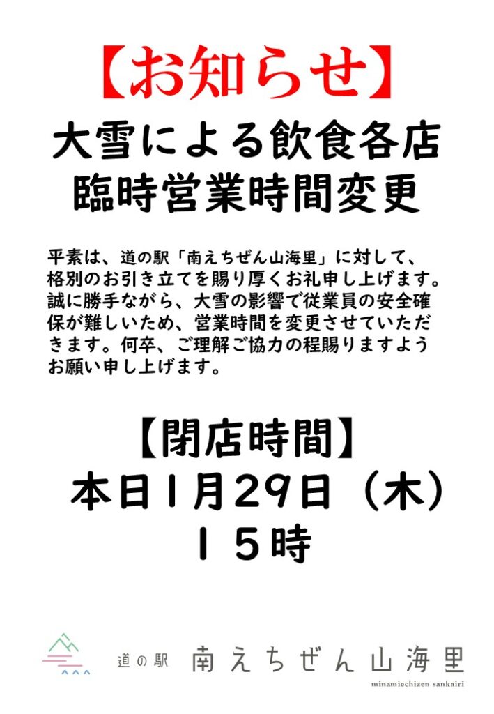 平素より道の駅 南えちぜん山海里をご利用賜り厚く御礼申し上げます。