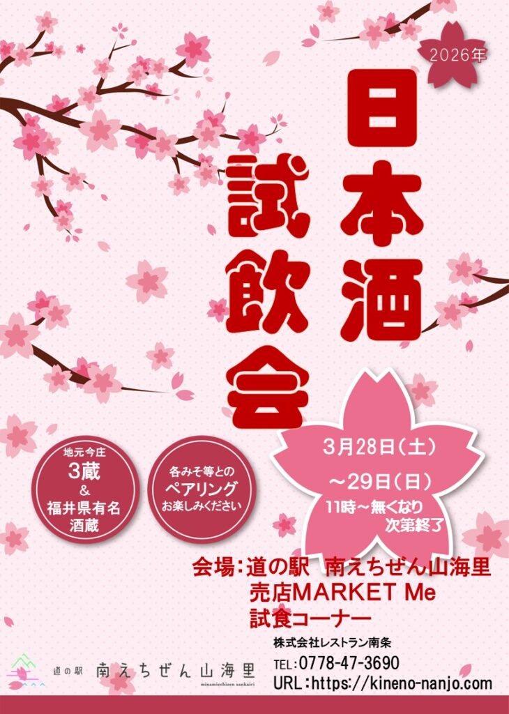 地元今庄地区には酒蔵が3件ございます。その酒蔵で作られた純米酒と当道の駅で販売する味噌などのご飯のお供になる商品とのペアリングを楽しむ試飲会を開催します。北陸有数の難所である山地を背にした「今庄宿」は、かつて山越えのため北国街道の宿場町として、江戸時代に越前で最も栄え、賑いをみせており、現在も江戸時代からの歴史的な街並みを残す旧宿場町です。約1キロの街道沿いには数百年以上の歴史をもつ4つの酒蔵が今も営み続けています。その日本酒の試飲とその日本酒に合うご飯のお供も一緒に試食できますので、是非お越しいただき、ペアリングを体験してみてください。